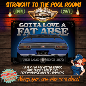FORD FALCON XB GT HARDTOP BLUE GOTTA LOVE A FAT ARSE FABRIC BANNER 1.5M x 1M
