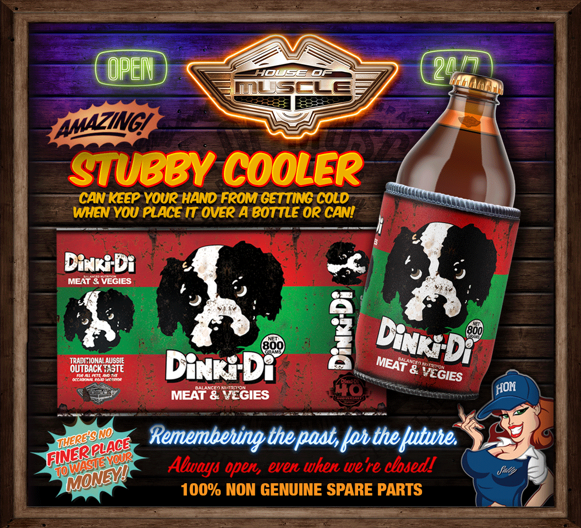 Sublimated neoprene drink cooler complete with pre-rust and pre-filthed for your pleasure stitched around top and bottom to give a faux can look Custom designed by Full Boar for House of Muscle