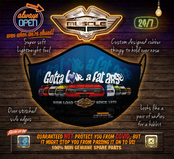 FORD FALCON HARDTOP GOTTA LOVE A FAT ARSE FACE MASK – ULTRA SMALL LIMITED RUN $19.99 includes $5.00 postage
