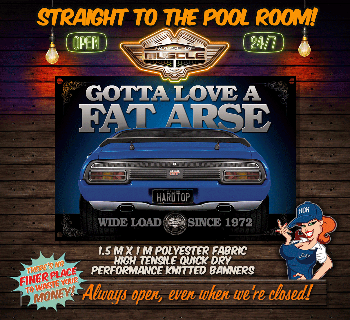 FORD FALCON XB GT HARDTOP BLUE GOTTA LOVE A FAT ARSE FABRIC BANNER 1.5M x 1M