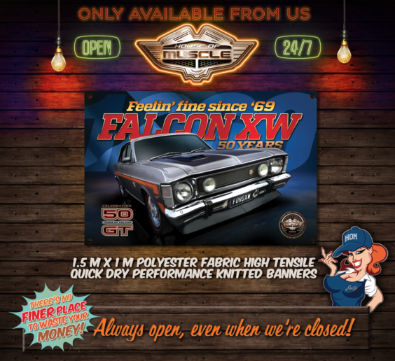 FORD FALCON XW 50TH ANNIVERSARY FABRIC BANNER FABRIC BANNER HOUSE OF MUSCLE DIGITALLY PRINTED
