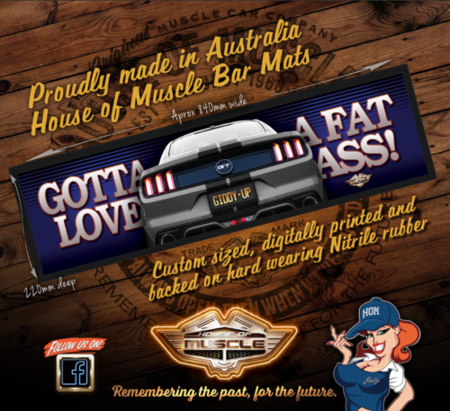 GOTTA LOVE A FAT ASS! AMERICAN STYLE MUSTANG BAR RUNNERSOUR SECOND IN A SERIES OF U.S. MUSCLE CARSBAR RUNNERS ARE AUSTRALIAN MADE FELT AND NITRILE RUBBERSIZE APPROX 840MM X 220MM DEEPARTWORK FROM FULL BOAR GRAPHIC DESIGN STUDIOS WITH OVER 40 YEARS EXPERIENCE IN BRANDING AND DESIGN