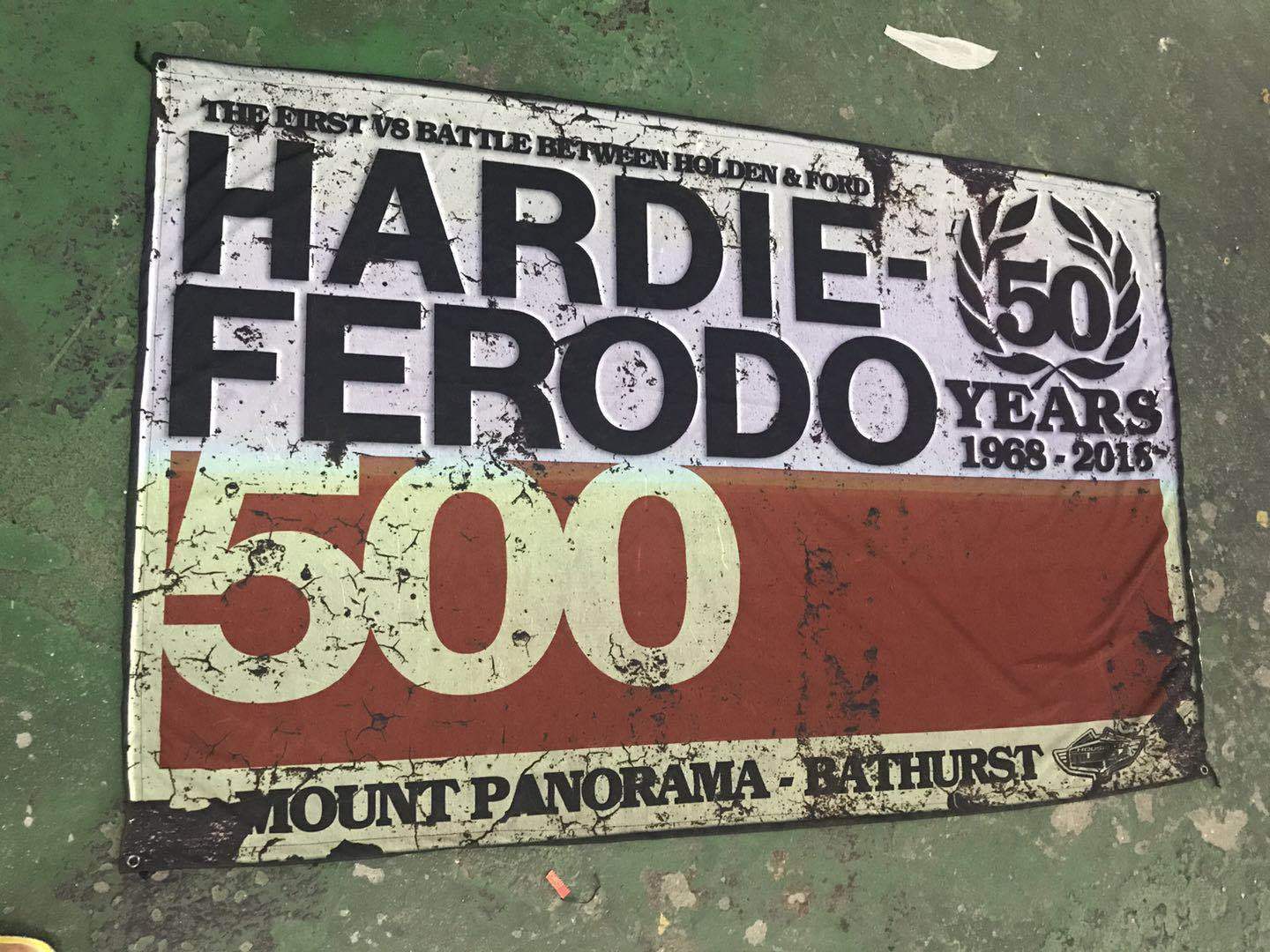 HARDIE FERODO 500 50TH ANNIVERSARY FABRIC BANNER FAUX RUSTED RETRO 100 DONE