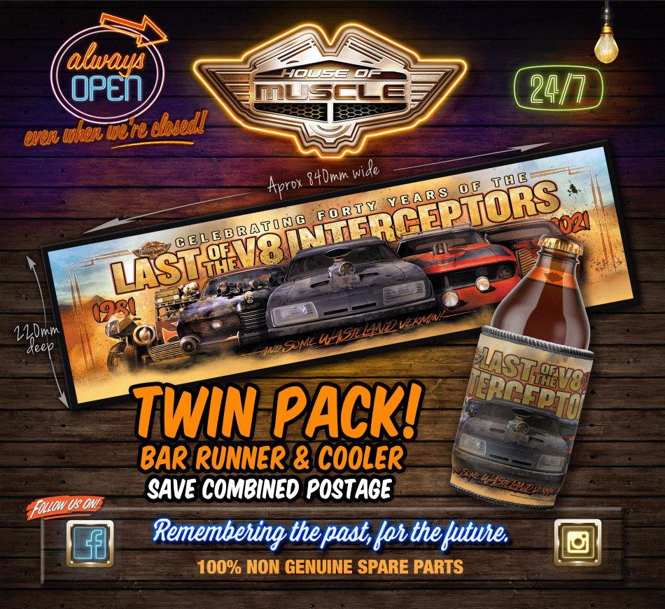 LAST OF THE V8 INTERCEPTORS 40 YEARS BAR RUNNER & STUBBY COOLER TWIN PACK By House of Muscle SAVE DOLLARS ON THE COMBINED POSTAGE