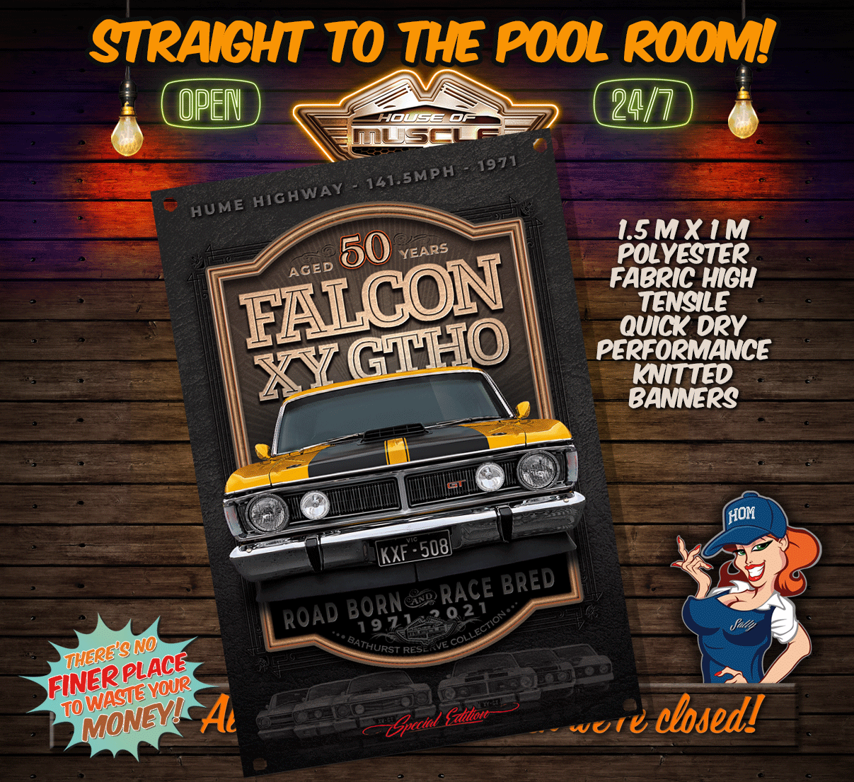 THE INFAMOUS GTHO DOWN THE HUME HIGHWAY “HO DOWN” FABRIC BANNER 1.5M x 1M