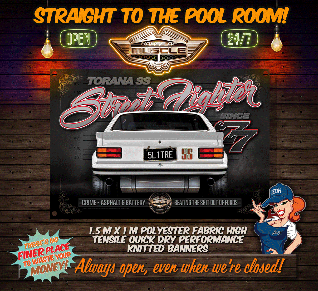 TORANA SS HATCH WHITE STREET FIGHTER FABRIC BANNER 1.5M x 1M